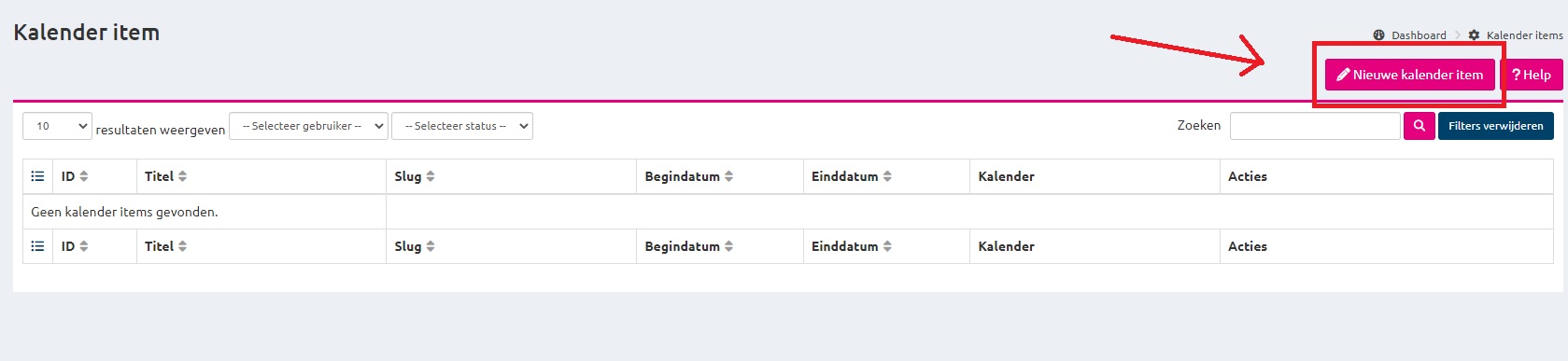 In het overzicht van kalenders kan je via de knop 'Nieuwe kalender item' een nieuwe kalender item toevoegen.