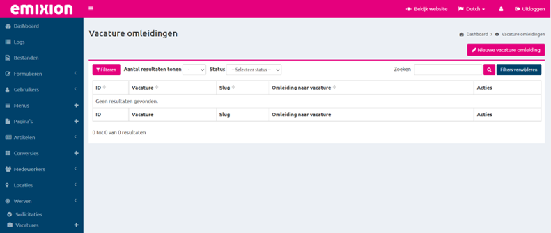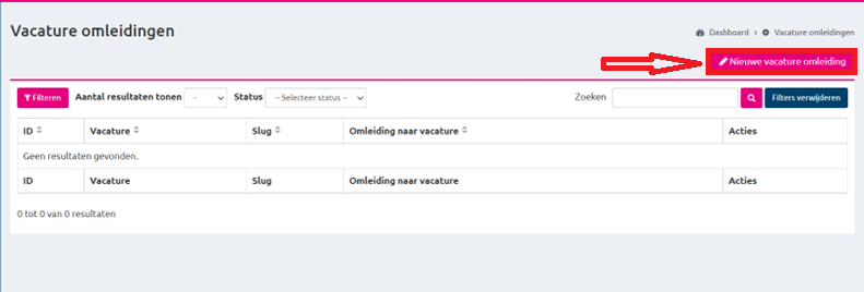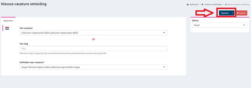 Als de gewenste vacature is gevonden kan je de omleiding opslaan.